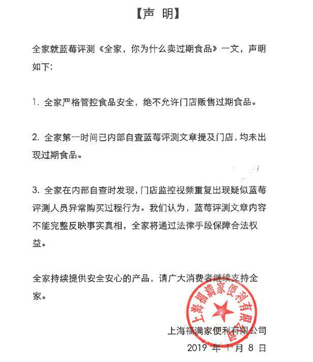 對此,全家發(fā)表聲明稱,首先全家嚴格管控食品安全,絕不允許門店販售過期食品;其次藍莓評測內容不能完整反映事實真相,全家將通過法律手段保障合法權益。