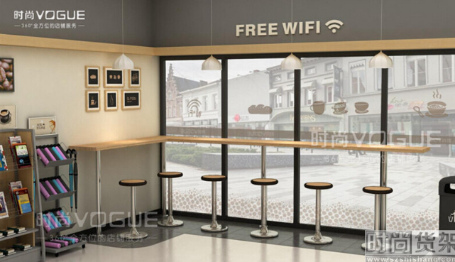 櫥窗吧臺是一種常用的休閑區(qū)打造方式。使用這款時尚貨架設(shè)計的,可以根據(jù)櫥窗大小定制長度的吧臺,加上幾把高腳凳,既不會占用過多便利店空間,還顯得簡約雅致。