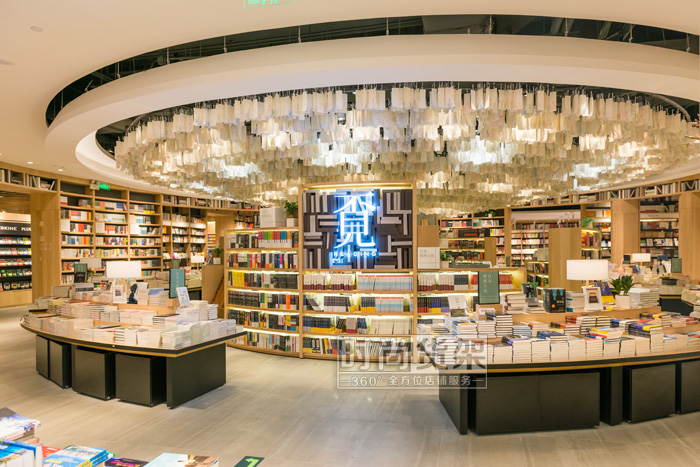 遠(yuǎn)遠(yuǎn)的向書店中庭看去,你還以為天花板上使用的是水晶吊燈,但走近了才發(fā)現(xiàn)它是用一頁頁書簽紙做的創(chuàng)意吊燈!質(zhì)樸的材質(zhì)卻讓中庭獲得了華麗的視覺外觀。