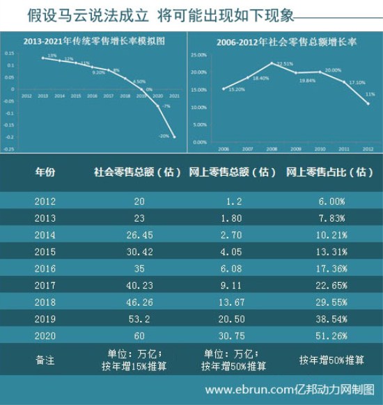 如果2020年網(wǎng)上零售占比達(dá)到50%,傳統(tǒng)零售將在2019年出現(xiàn)負(fù)增長,而在2020年甚至?xí)霈F(xiàn)13%的負(fù)增長。面對這樣幾乎不可能實(shí)現(xiàn)的目標(biāo),馬云的信心可還在?