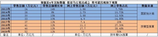 那么結(jié)合實(shí)際數(shù)據(jù),未來4年網(wǎng)上零售和傳統(tǒng)零售要達(dá)到怎樣的成績,馬云才能賭贏?