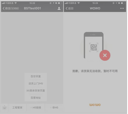 億邦動力網(wǎng)隨后查看了百世店加、百世鄰里等官方微信號,均未找到“貨架”入口,但卻在百世店加旗下的另一個公眾號“BSTtest”中發(fā)現(xiàn)了一點“痕跡”。該公眾號中設(shè)有入口“XX具體貨架頁面”,點擊進(jìn)入后,頁面顯示“貨架暫時無法收款”,而頁面中出現(xiàn)的“WOWO”字樣也疑似貨架的落地地點——百世集團(tuán)在去年收購的WOWO便利店。