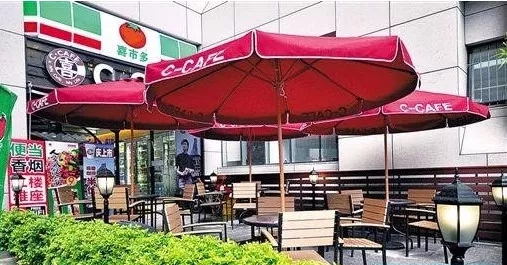 在便利店的店門外,撐幾把帶有品牌logo的遮陽傘,再擺幾把藤桌藤椅,一個(gè)既可以裝飾門店外觀,又易于清潔移動(dòng)的室外休閑區(qū)就打造完成。非常適合店面不大卻又需要休閑區(qū)的便利店。