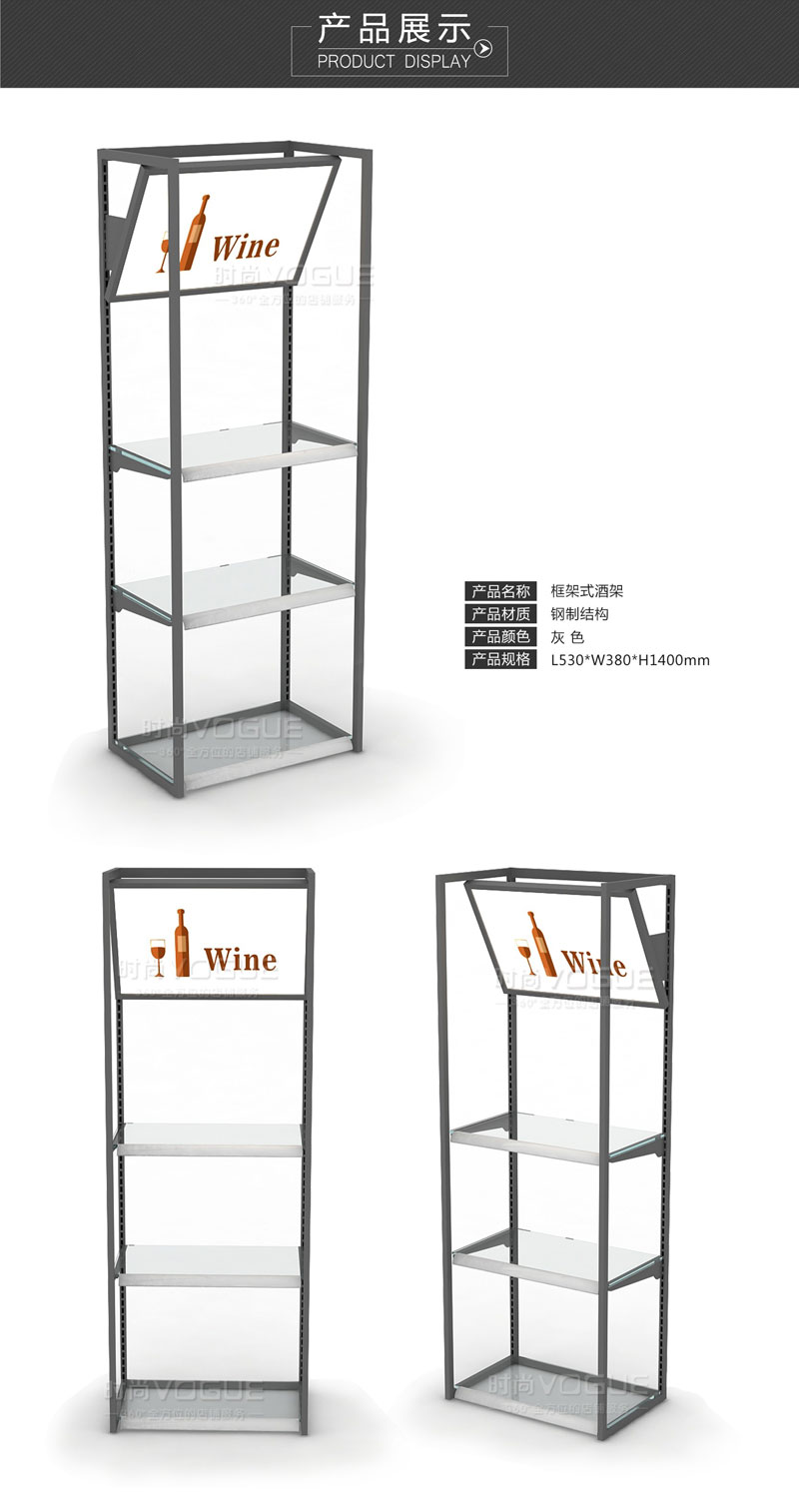 - 產(chǎn)品描述:此款便利店貨架是時(shí)尚貨架專(zhuān)為便利店客戶(hù)設(shè)計(jì)的一款框架式白酒展示架。