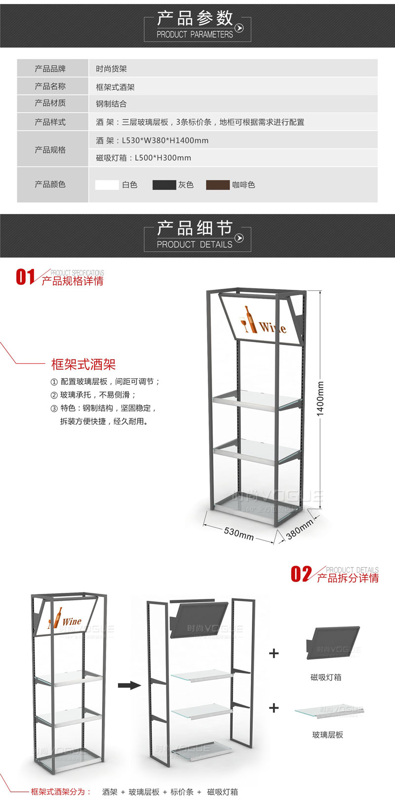 4、時(shí)尚貨架所售產(chǎn)品均是可拆卸的組合貨架,價(jià)格要根據(jù)具體型號(hào)、款式及配件數(shù)量來(lái)決定。