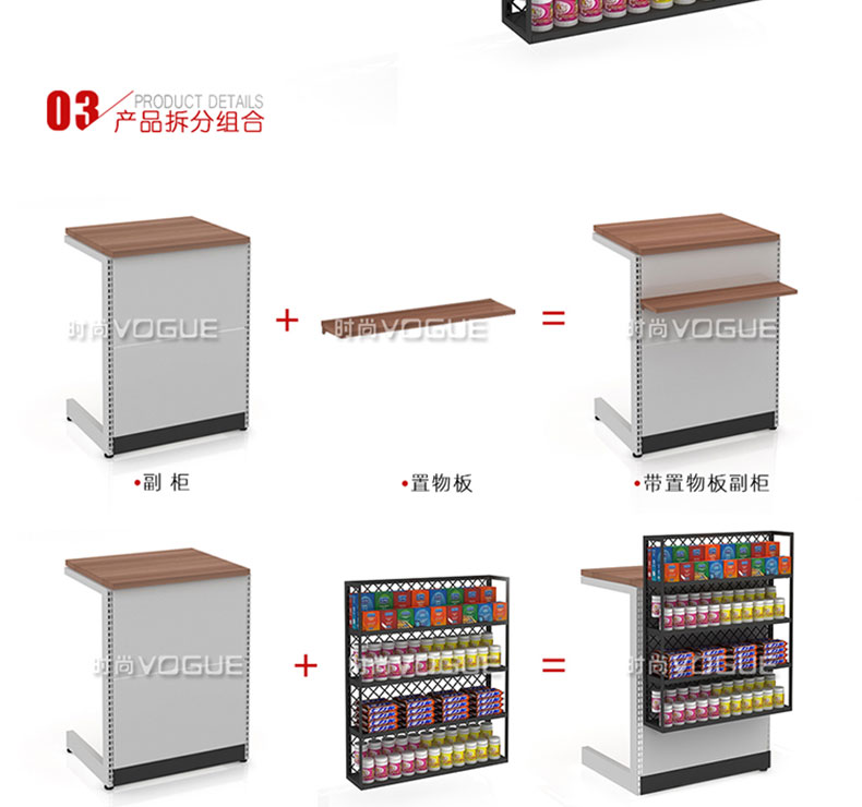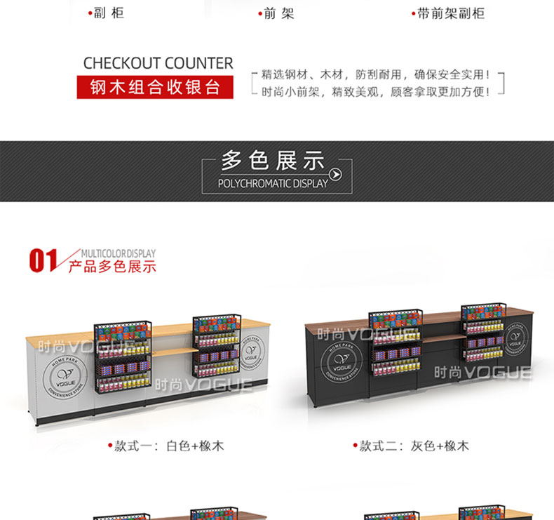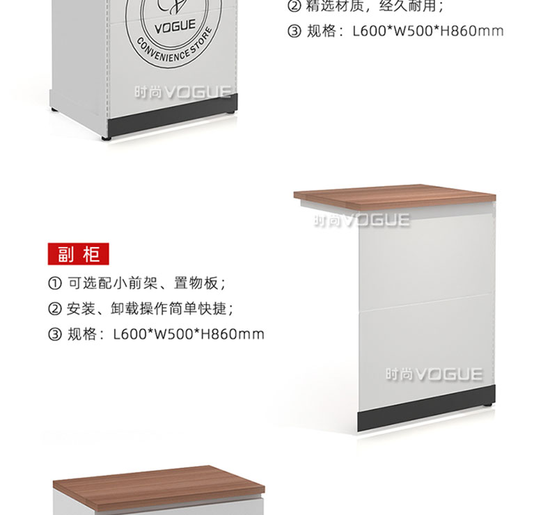 【特點(diǎn)】組合形式,滿足不同收銀區(qū)需求;精選材質(zhì)使用壽命長(zhǎng);擴(kuò)展側(cè)面空間增強(qiáng)收銀臺(tái)功能