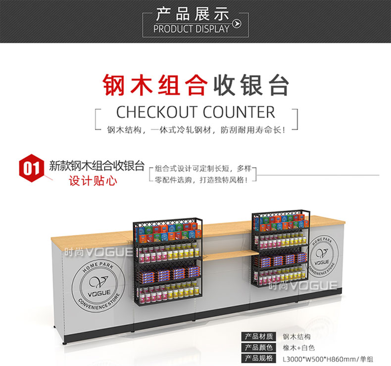 【產(chǎn)品名稱】便利店鋼木收銀臺(tái)/超市組合收銀臺(tái)/帶前架轉(zhuǎn)角收銀臺(tái)